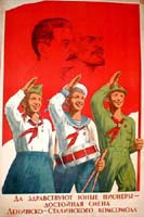 "Слышат горы, долины и реки. Слышит каждая травка в пути. Ленин с нами. Он с нами навеки, А в суровой борьбе впереди."